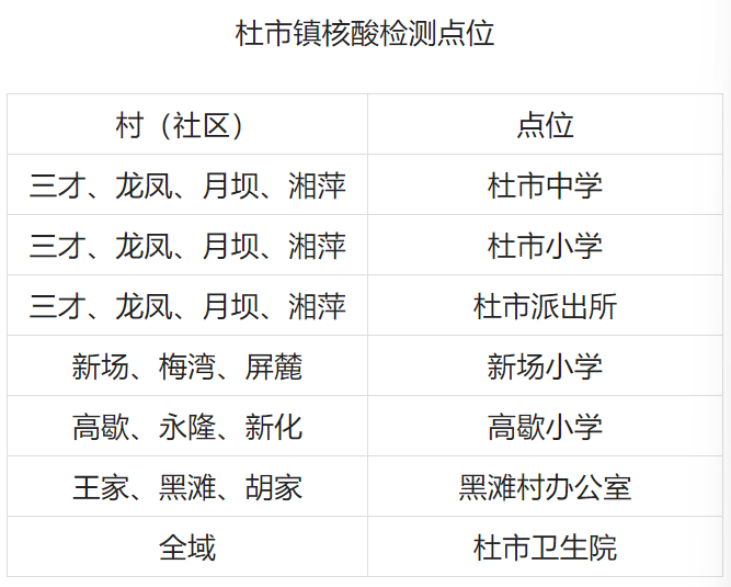 为方便大家及时进行核酸检测,杜市镇在全镇13个村(社区)共设置7个免费核酸检测点,请您第一时间到本村(社区)核酸检测点进行检测。