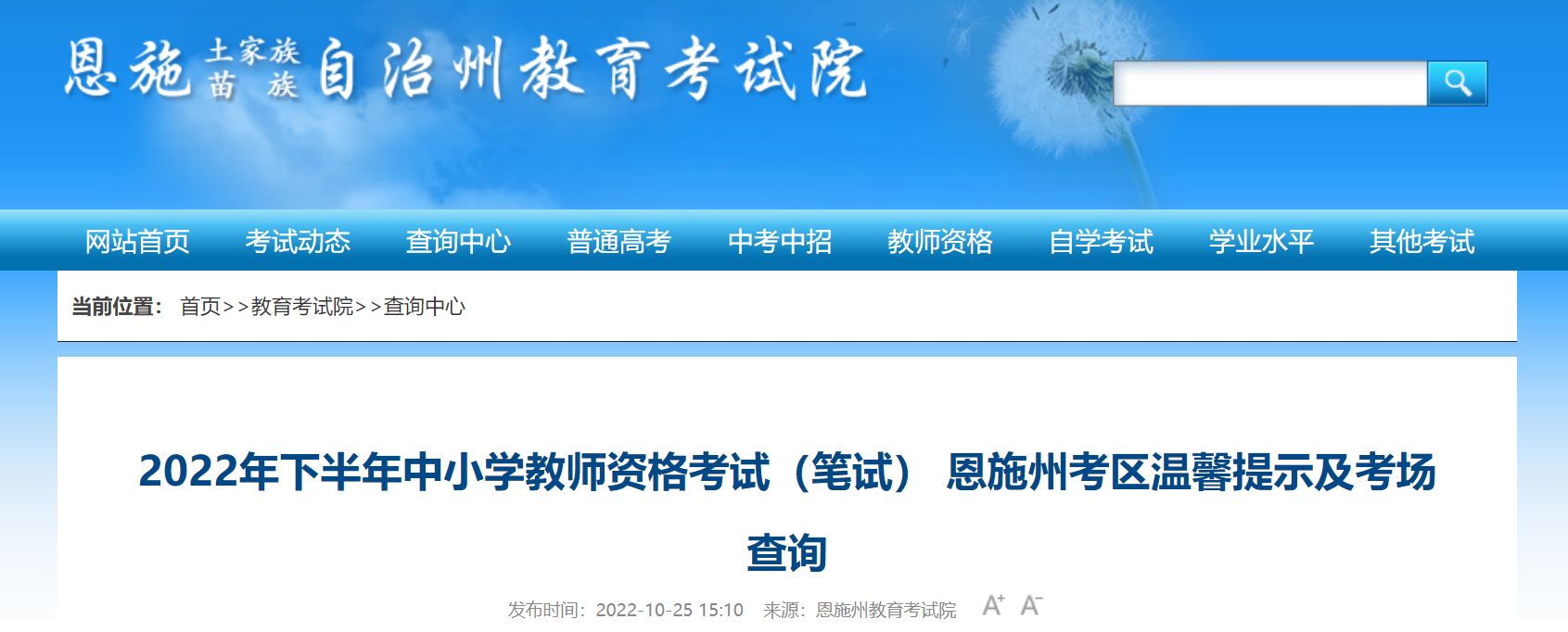 恩施州教育考试院在《2022年下半年中小学教师资格考试(笔试) 恩施州考区温馨提示及考场查询》通知中称:
