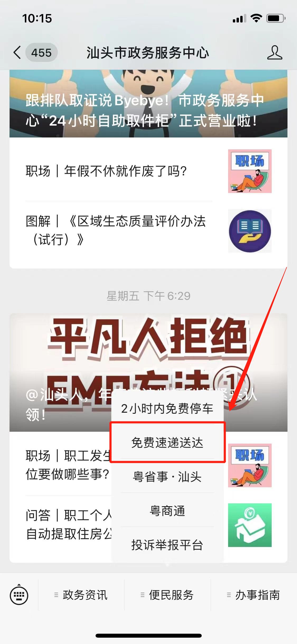 “汕头市政务服务中心”微信公众号 → 便民服务 → 免费速递送达 → 自助取件登记。