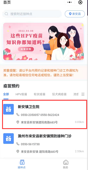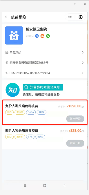 1.进入“知苗预约”页面,选择“新安镇卫生院”