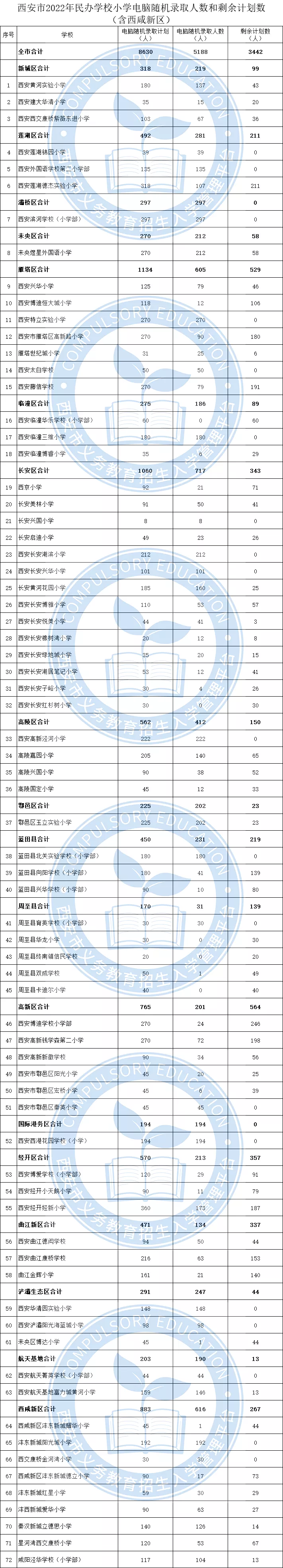 2022西安民办小学招生录取人数和剩余计划数一览表