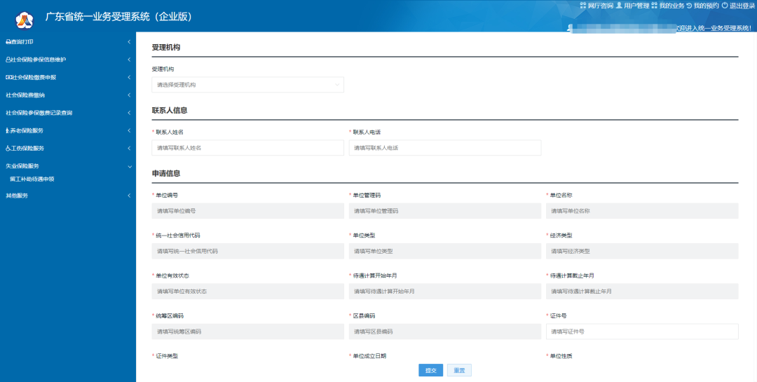 第二步:进入申报页面,选择受理机构,填写联系人信息和申请信息。