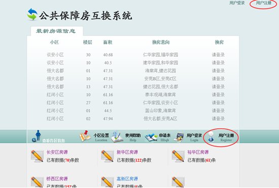 点击下图红色圆圈标注的“用户注册”,填写保障对象信息,点击注册用户,注册用户时会验证是否符合换房条件,注册成功进入系统。