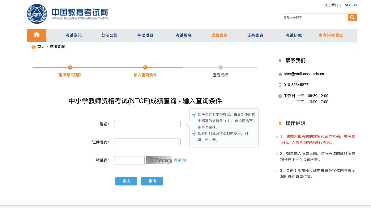 第二步:进入成绩查询入口,输入姓名、证件号码、验证码等信息,点击查询按钮进行查询。如果输入信息正确,对应考试的成绩信息将会在下一个页面列出。