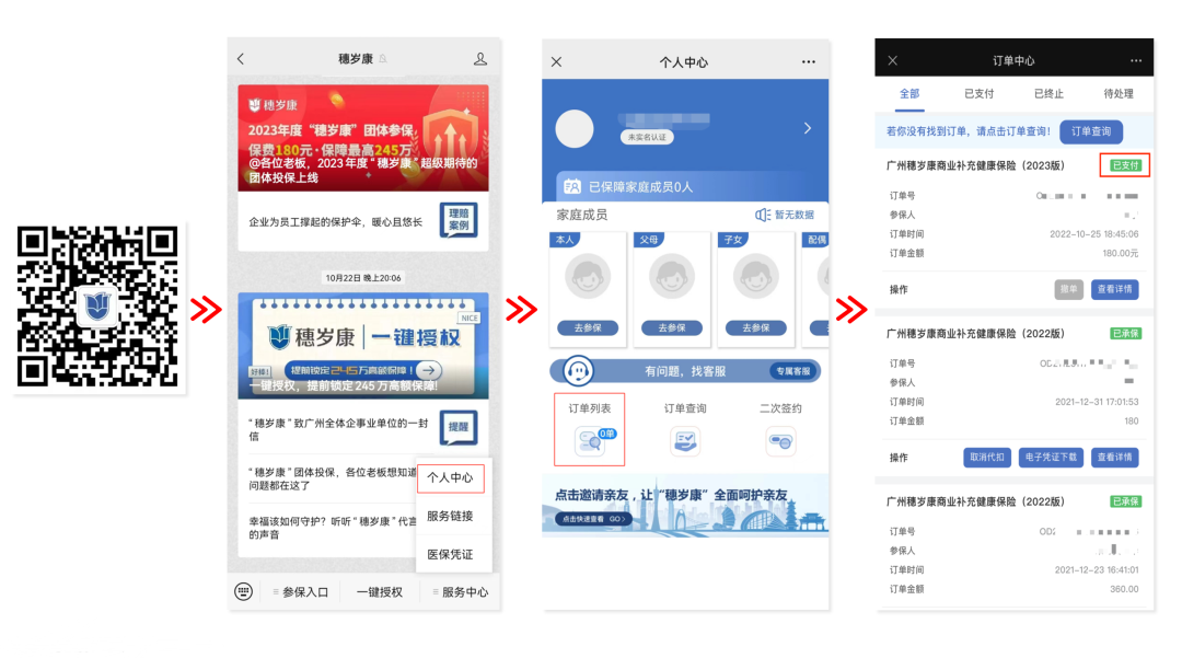 参保人可通过“穗岁康”微信公众号,点击服务中心“个人中心”→“订单列表”,查询2023年度是否缴费成功,订单右上角“已支付”为缴费成功。