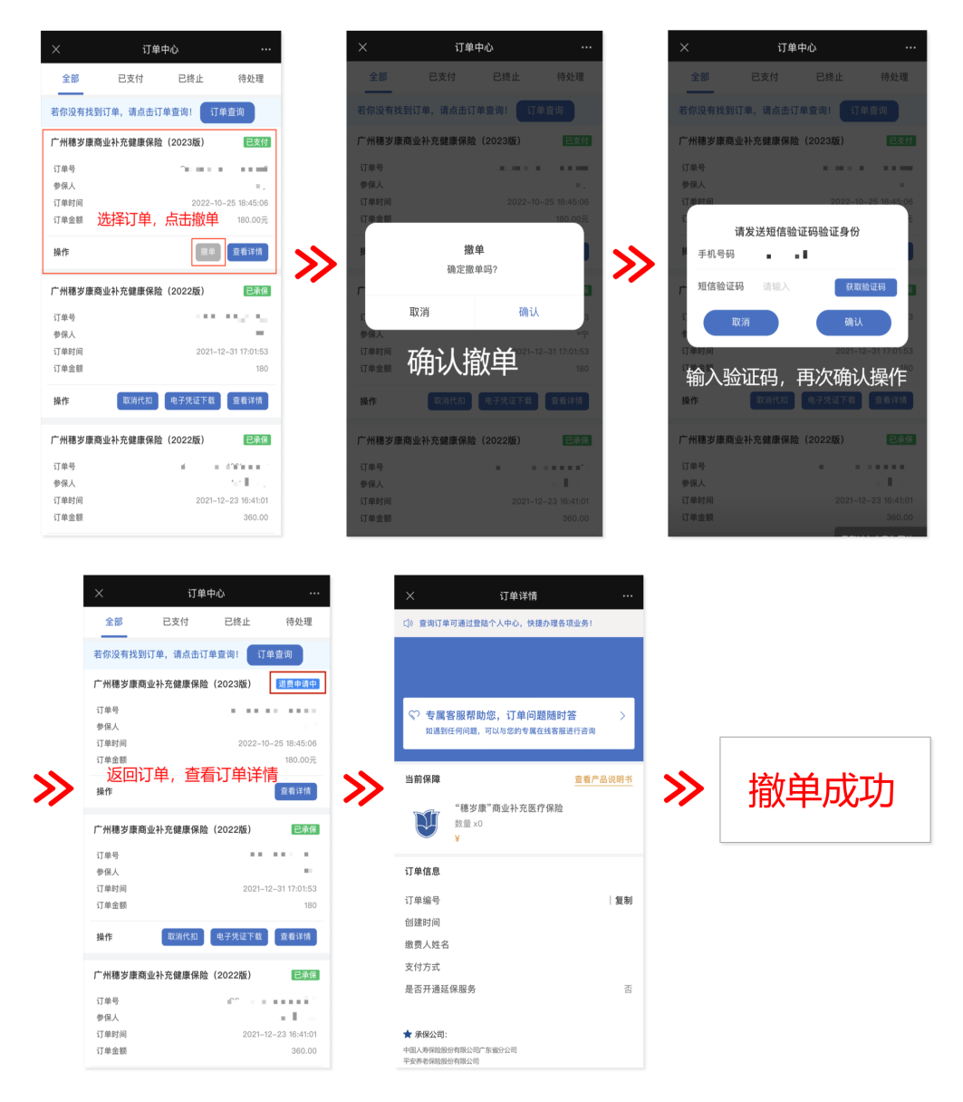 2023年“穗岁康”成功扣费后,将收到扣费通知;如需要撤销订单,可在订单生效前(2023年1月1日),在“穗岁康”公众号一一个人中心一一订单查询撤销订单,如您无法自主操作,可前往线下服务网点,由工作人员协助您完成撤单退费。