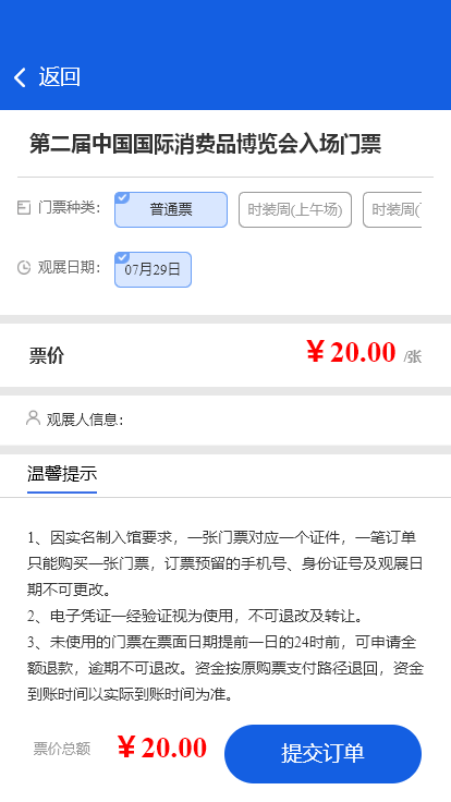 2.进入购买页。选择观展日期、核对观展人信息后,点击“提交订单”。