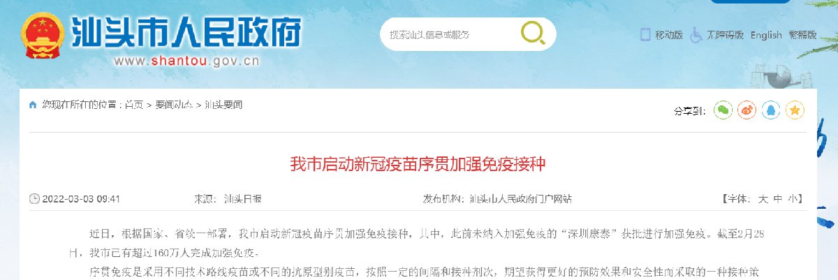 近日,汕头市宣布启动新冠疫苗序贯加强免疫接种,序贯加强免疫策略实施后,完成全程接种上述三种灭活疫苗的目标人群,还可选择智飞龙科马生物制药有限公司的重组蛋白疫苗或康希诺的腺病毒载体疫苗进行序贯加强免疫。