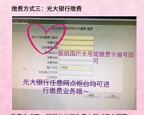 光大银行缴费:提供用户卡号或缴费卡编号即可输入方式,光大银行任意网点柜台均可进行缴费业务