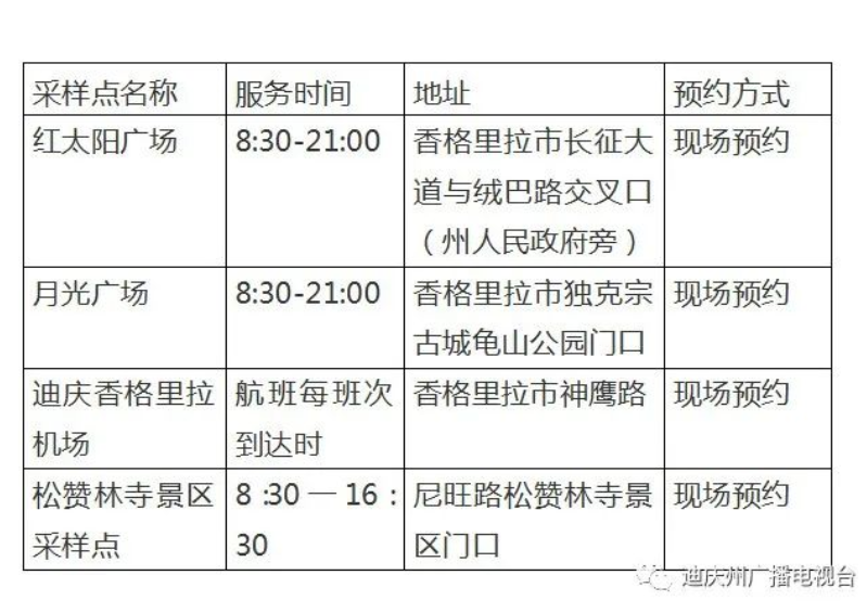 香格里拉市松赞林寺景区采样时间每天8:30一16:30,机场采样时间为每班次航班到达时。