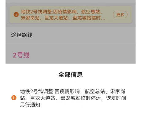 截至10月31日上午9点,通过致电武汉地铁人工客服(027—96556)确定地铁2号线调整:因疫情影响,2号线航空总部站、宋家岗站、巨龙大道站、盘龙城站临时停运,恢复时间另行通知。