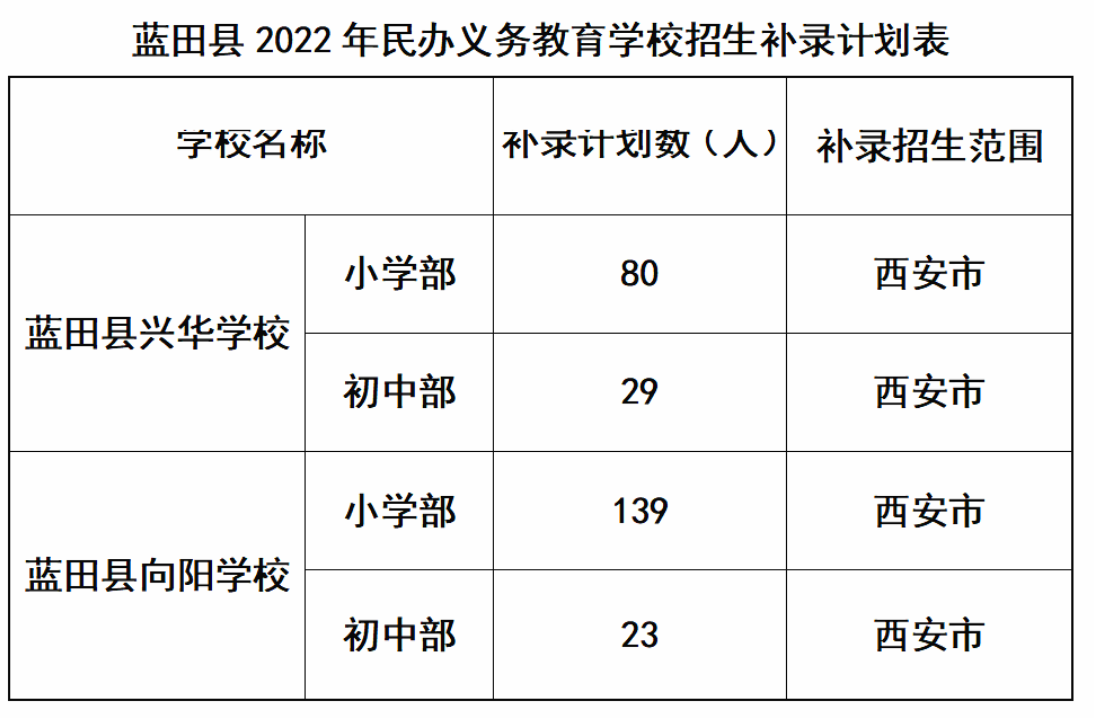 按照西安市义务教育学校招生入学工作安排,现将2022年蓝田县民办义务教育学校补录计划公布如下: