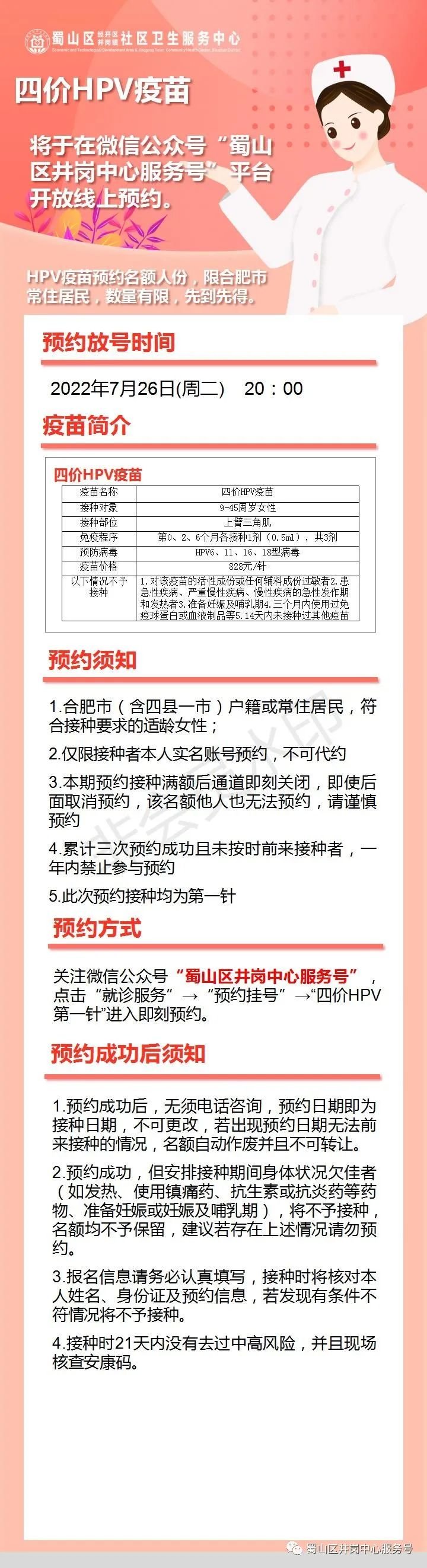 合肥蜀山区经开区井岗社区卫生服务中心,四价HPV疫苗将于在微信公众号“蜀山区井岗中心服务号"平台开放线上预约。