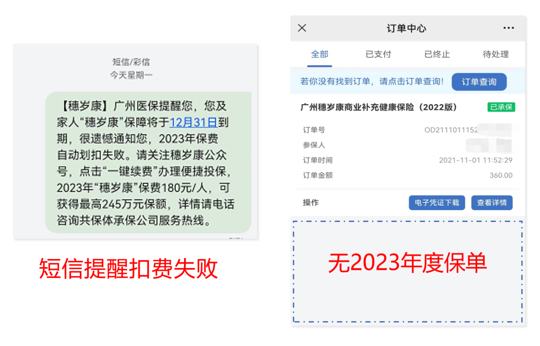 如收到如下短信提醒,或在“穗岁康”订单查询界面未查询到2023年保单信息,则扣费失败,可能导致扣费失败原因为余额不足等,请在11月1日通过“穗岁康”公众号—参保入口—一键续费,进行投保缴费。