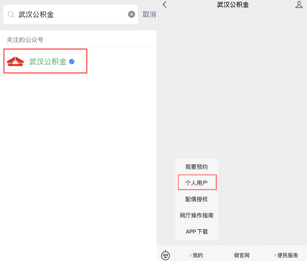 1、微信搜索“武汉公积金”微信公众号,进入后选择菜单栏“我的-个人用户”。