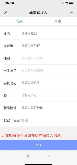 2、点击添加患者,录入个人信息和ID号(如有我院ID号的直接录入,若未办卡,请先录入其他个人信息,点保存系统自动生成ID号。如需要诊疗卡请去门诊收费处补办);儿童如果无身份证号,可录入监护人的信息(在父亲身份证号码前加“F”,或在母亲身份证号码前加“M”)。