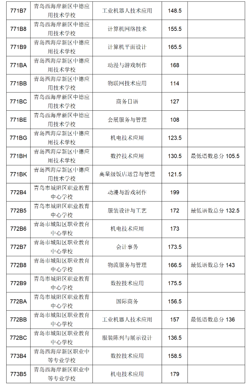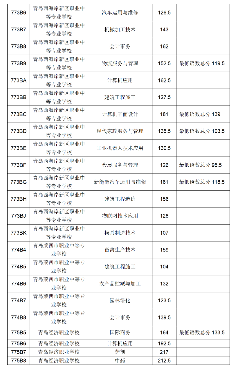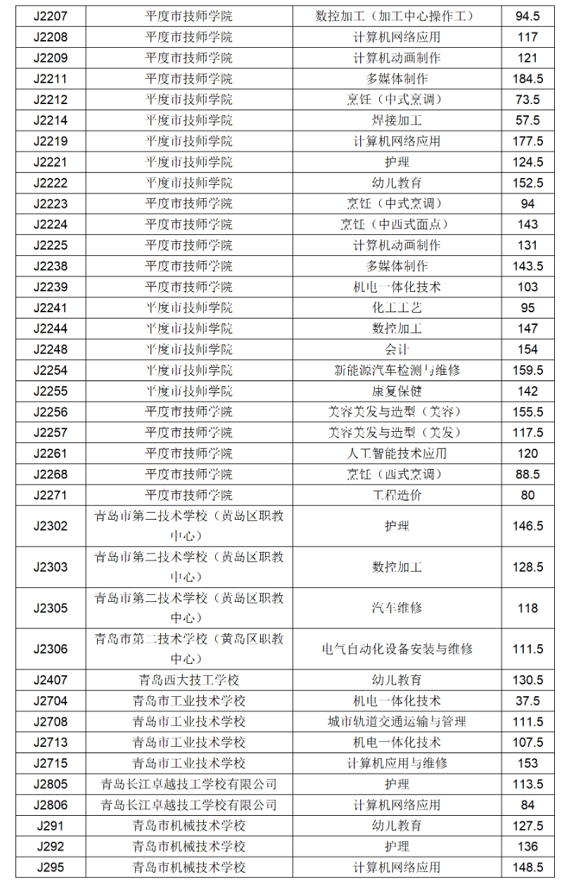 五、青岛市职业、技工学校三年制中职技校录取满额专业录取分数线