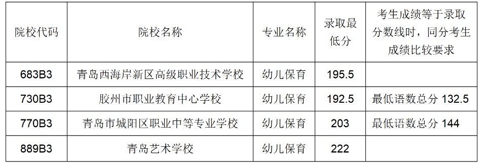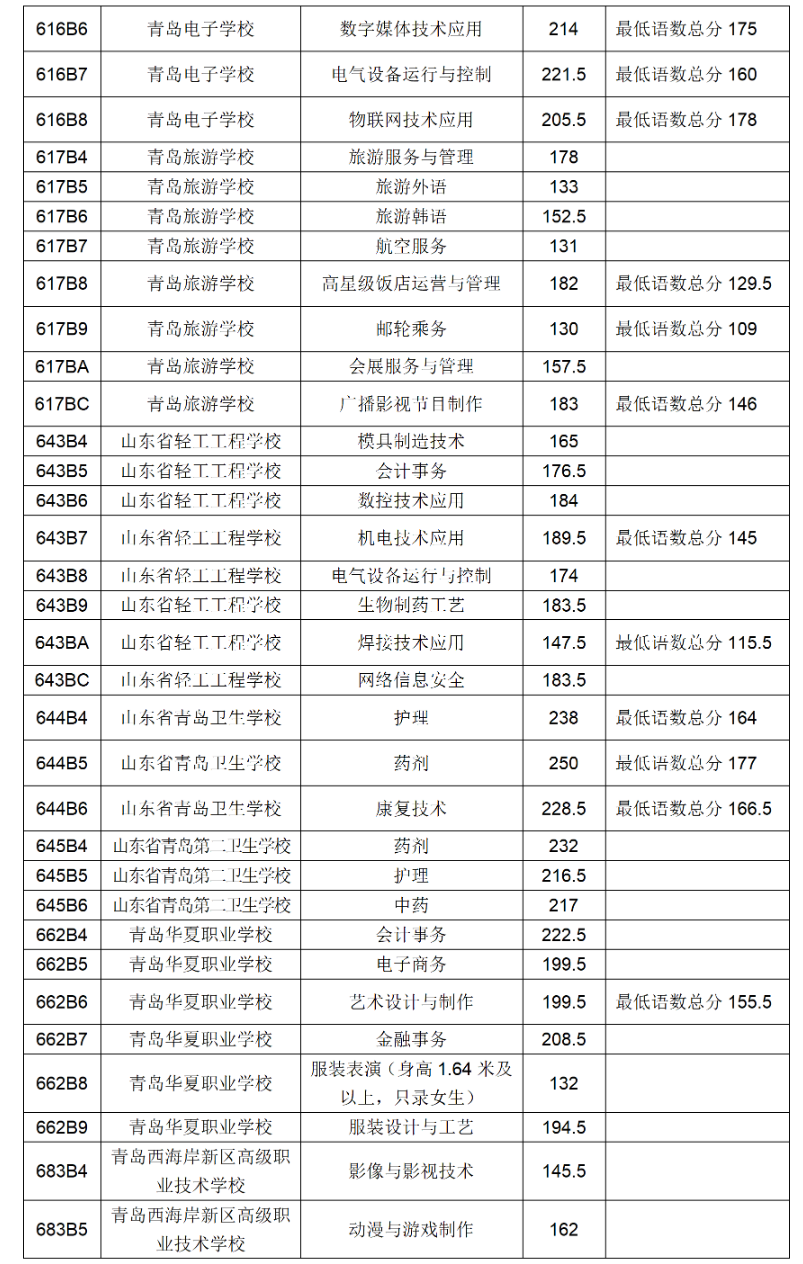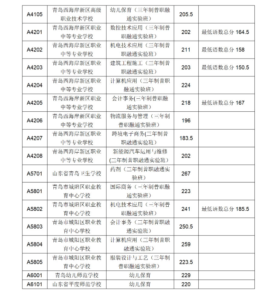 四、青岛市职业学校五年制高职(含五年一贯制告知和三二连读高职)录取满额专业录取分数线