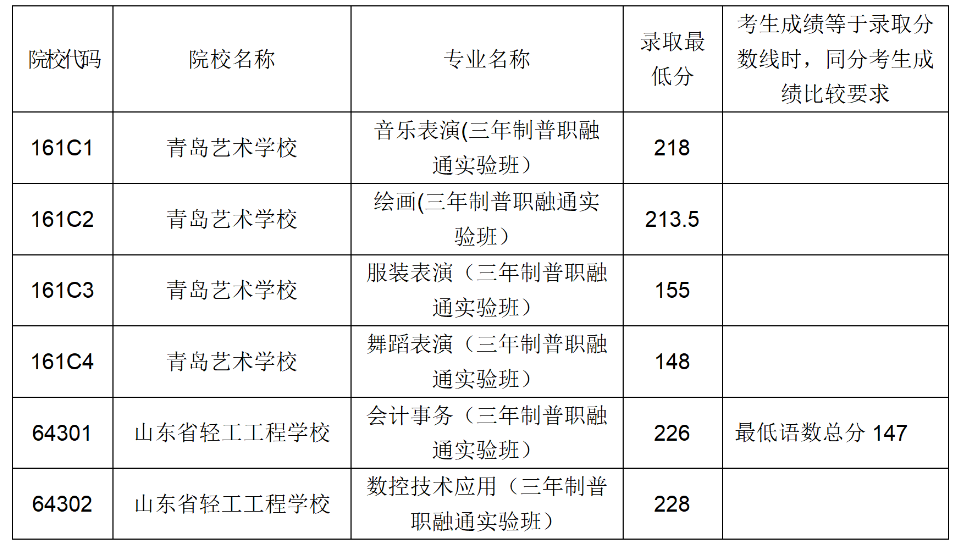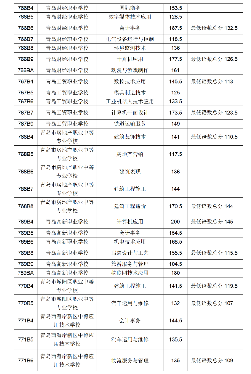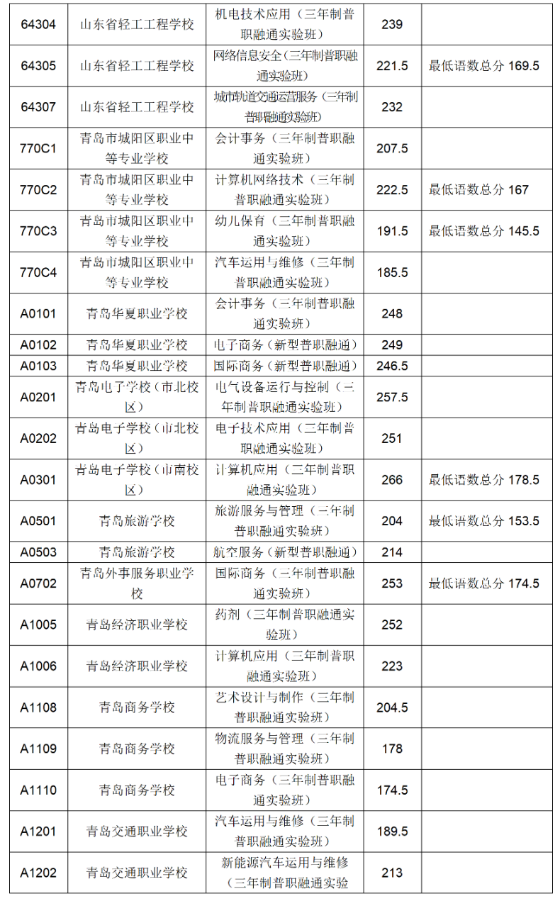 四、青岛市职业学校五年制高职(含五年一贯制告知和三二连读高职)录取满额专业录取分数线