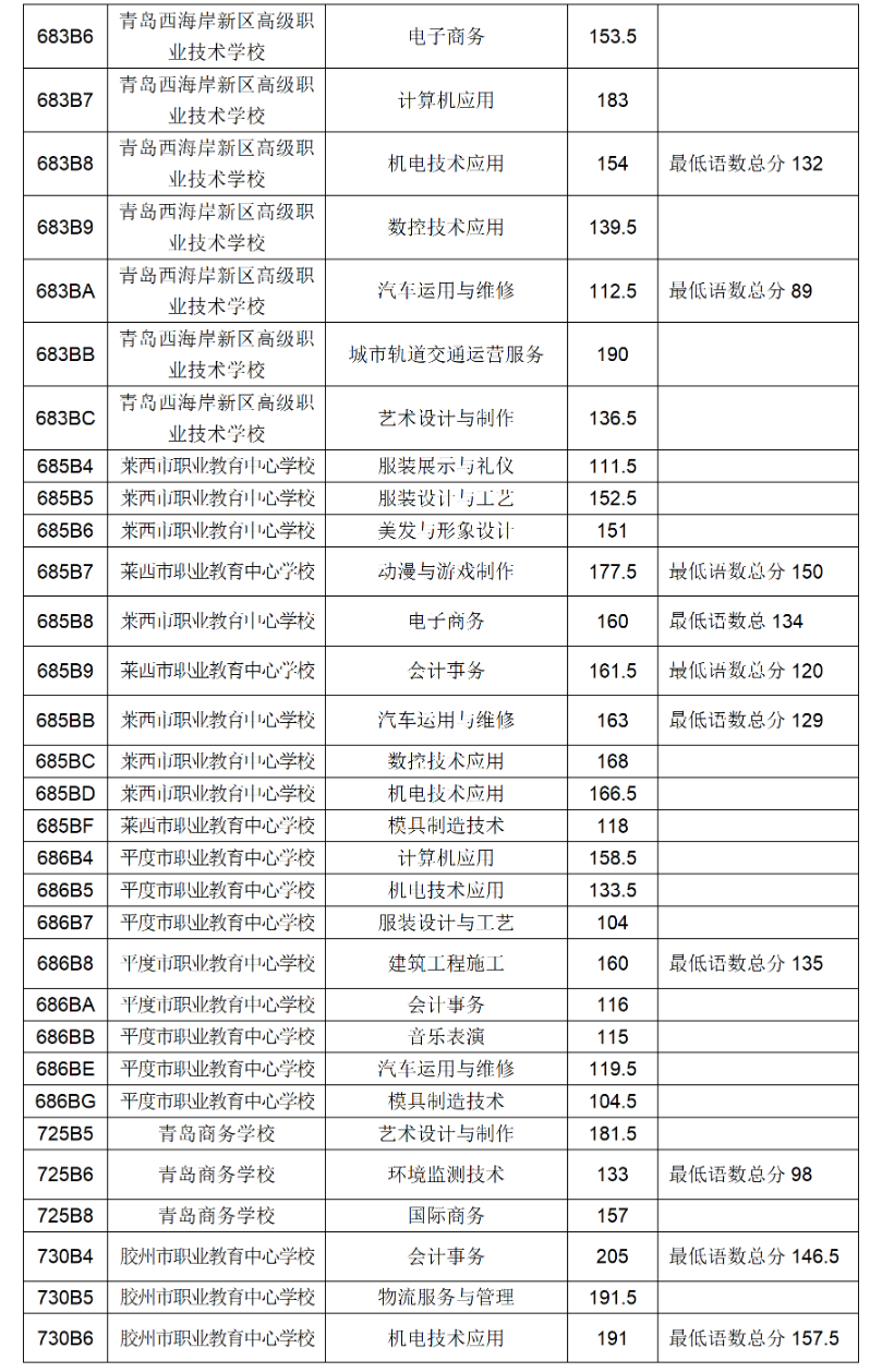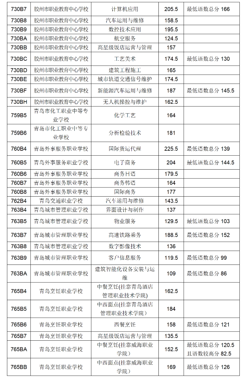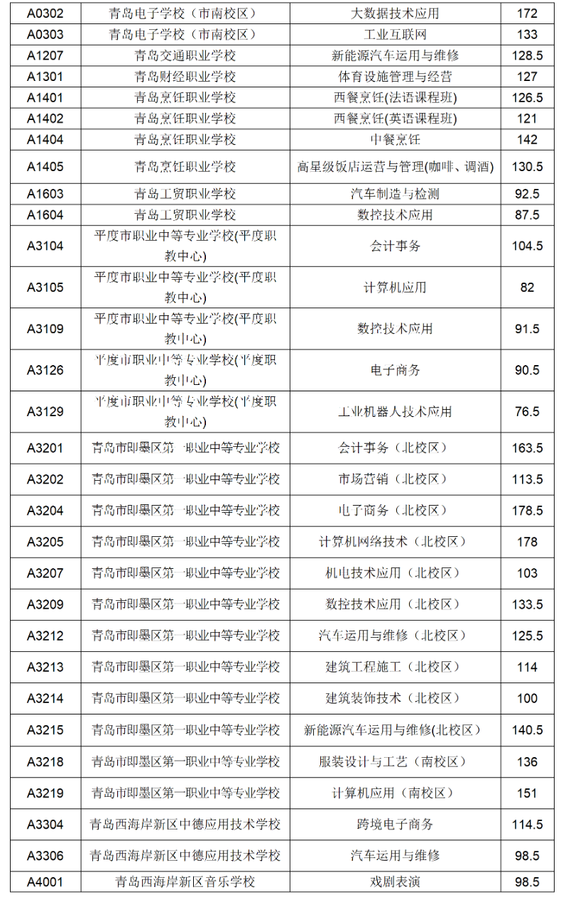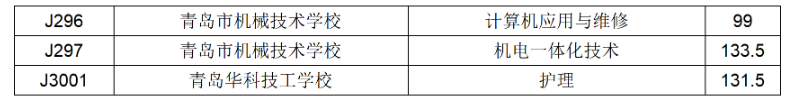 五、青岛市职业、技工学校三年制中职技校录取满额专业录取分数线