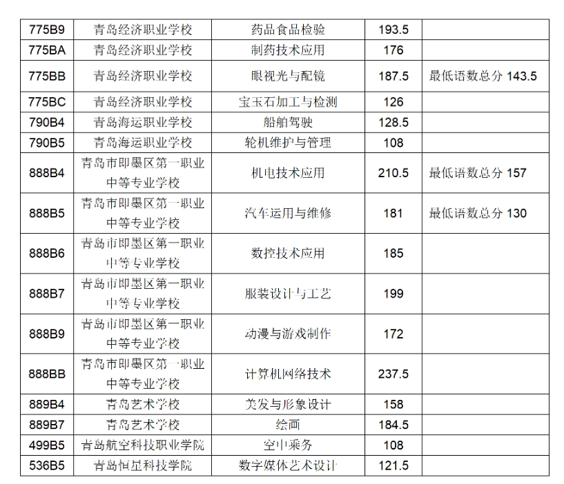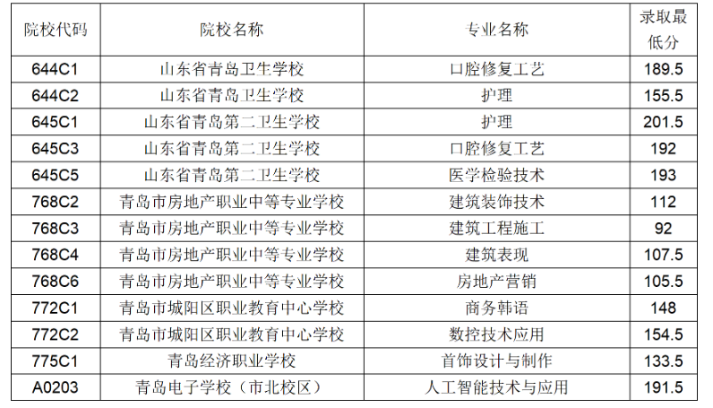 2022年青岛市职业类学校第一阶段招生录取分数线公告