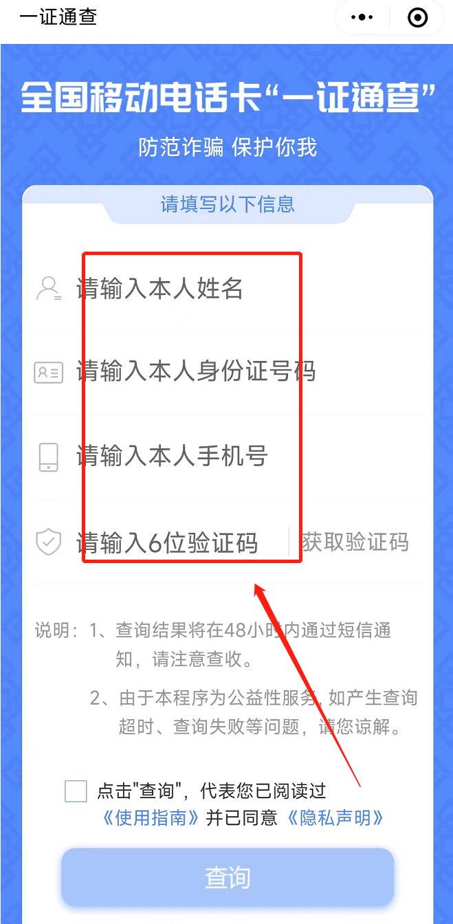 第四步:在查询页面填写姓名、手机号码、身份证号码后六位和验证码,即可进行查询。查询结果将在48小时内通过10699000统一的短信端口进行回复。