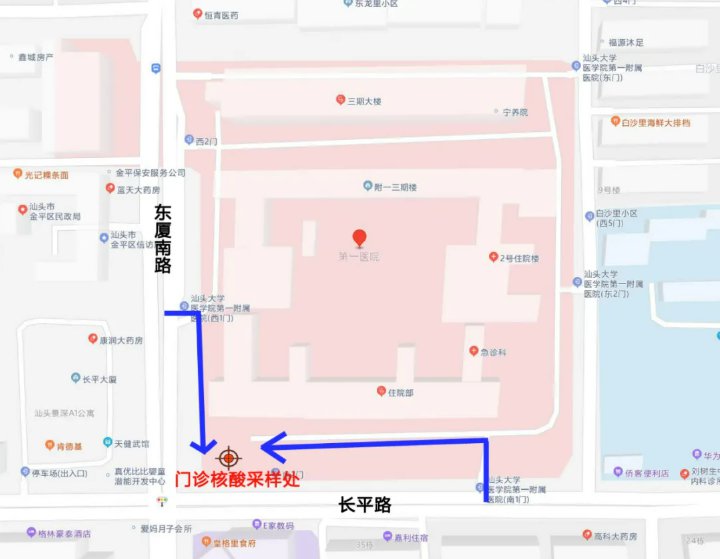 1、门诊核酸采样点:位于长平路与东厦路交界处、一号楼西南侧。新入院、陪护人员和“愿检尽检”人员可由长平路入口进入后,沿左侧斜坡直行至下坡终点,或由东厦南路门诊西门进入后右拐。