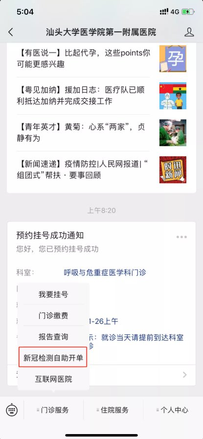 ①关注”汕头大学医学院第一附属医院“官方微信公众号,绑定诊疗卡,进入“门诊服务-报告查询“栏,即可查询核酸检测结果。
