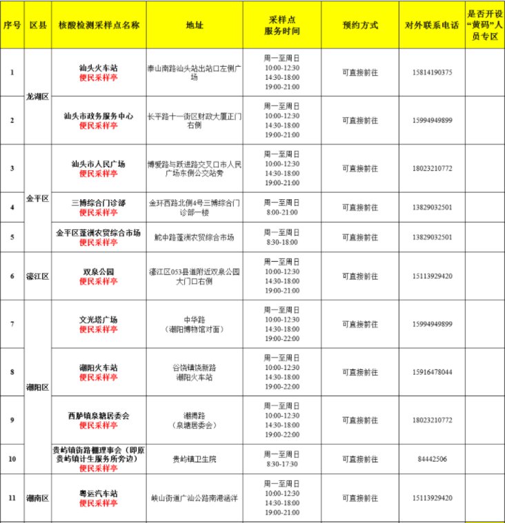 ➤汕头市便民核酸检测采样点: