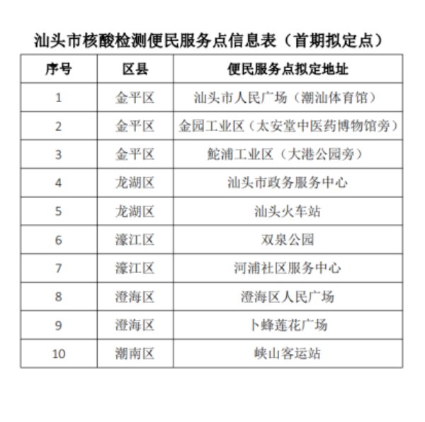 为市民群众提供便捷高效的核酸检测服务,汕头市在火车站、人民广场、行政服务中心等开阔公共场所试点建设便民核酸采样点,现已陆续投入使用。