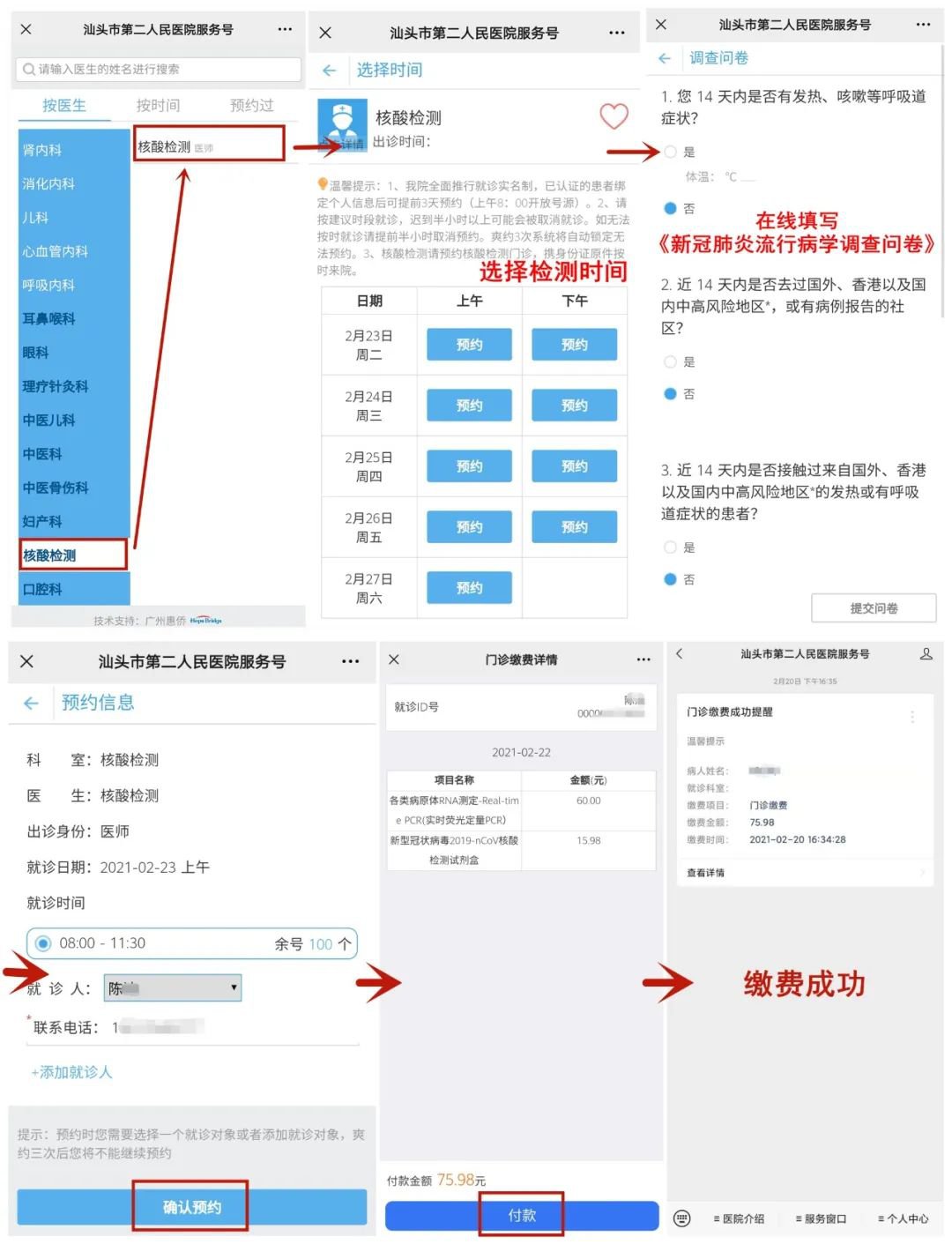 根据您的实际情况预约时间,按照操作指引进行就诊人信息绑定、调查问卷填写、确认预约检测时间段并完成缴费。