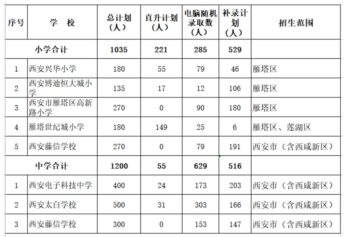 根据《西安市教育局关于做好2022年义务教育招生入学工作的通知》(市教发〔2022〕76号)精神及日程安排,现将雁塔区2022年民办义务教育学校招生补录计划公示如下: