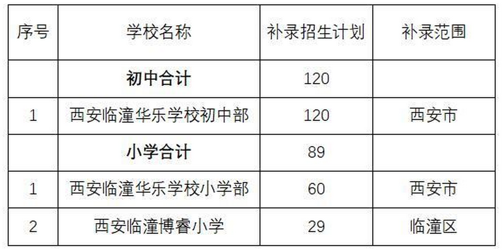 按照《西安市教育局关于做好2022年义务教育学校招生入学工作的通知》(市教发〔2022〕76号)要求,临潼区民办义务教育学校申请补录剩余招生计划,经市教育局核准,现将2022年临潼区民办义务教育学校招生补录计划公布如下: