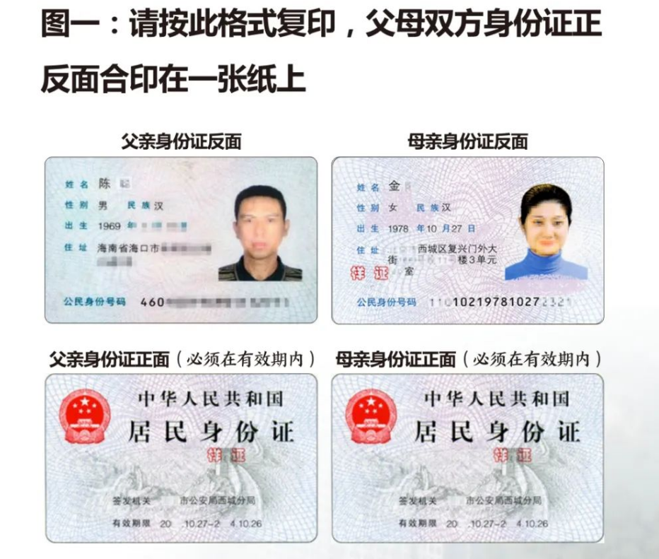 父母身份证原件及复印件(双方正反面合印在一张纸上,且在有效期内)