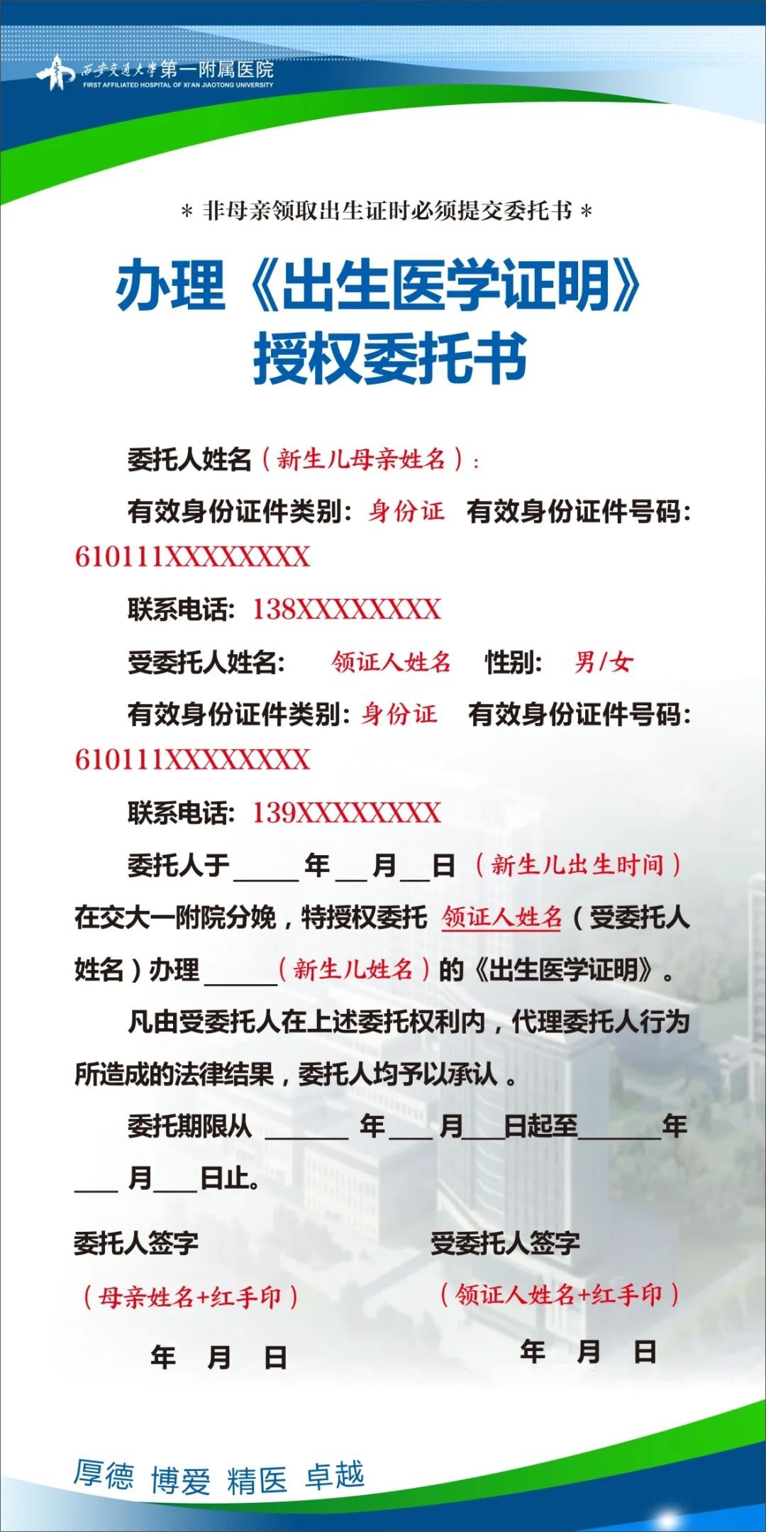2、若领证人不是新生儿母亲,还需提供新生儿母亲签字的委托书以及领证人本人有效身份证件原件及复印件;