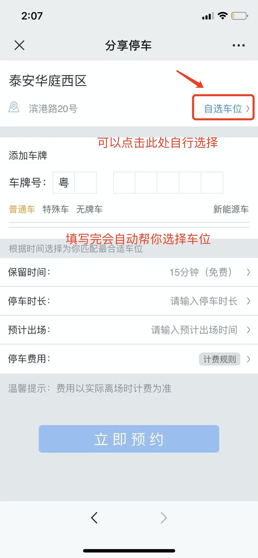 选中心仪的停车场,点击进入停车场选择停车位。填写车牌号码后,通过【停车时长】或【预计出场】二选一即可一键预约车位。