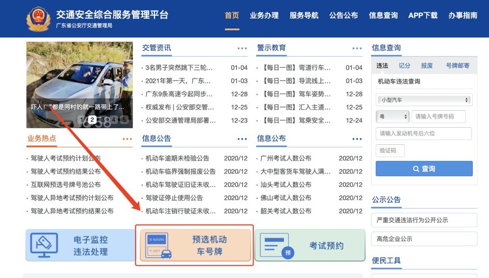 选择网上选号的,可以通过互联网交通安全综合服务管理平台(http://gd.122.gov.cn)或者下载登录交管12123手机APP选择,网上选号完成后,需打印选号凭证,在两个星期内到车管所窗口进行号牌确认。