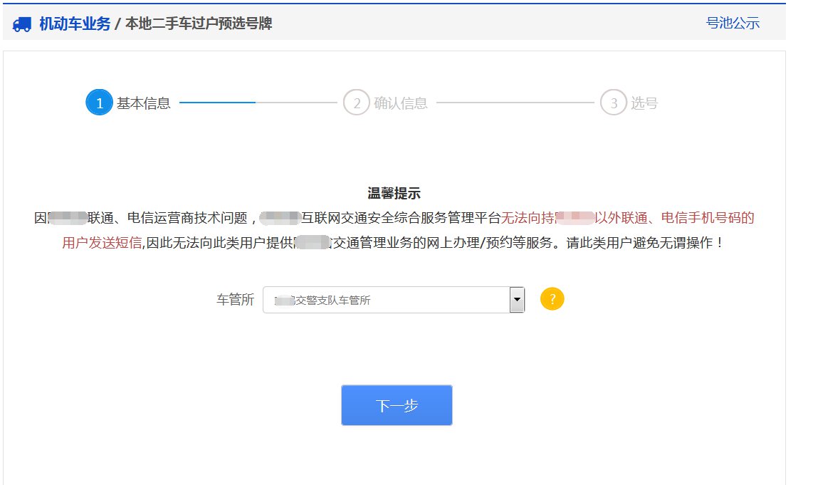 用户首次进入该功能,系统将显示预选号牌服务说明页面,点击页面中【提交信息】按钮,进入第一阶段【基本信息】步骤,应选择本人或本单位办理本地二手车过户业务的车管所,如下图所示。