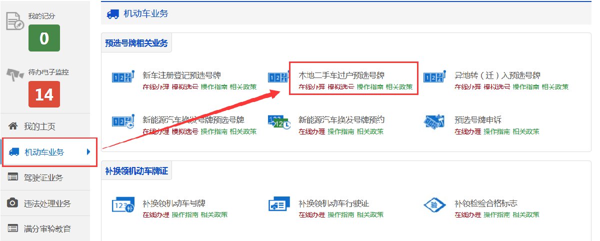 互联网注册用户在互联网登录后,点击【机动车业务】→【预选号牌相关业务】下的【本地二手车过户预选号牌】进入预选号牌流程。如下图所示。