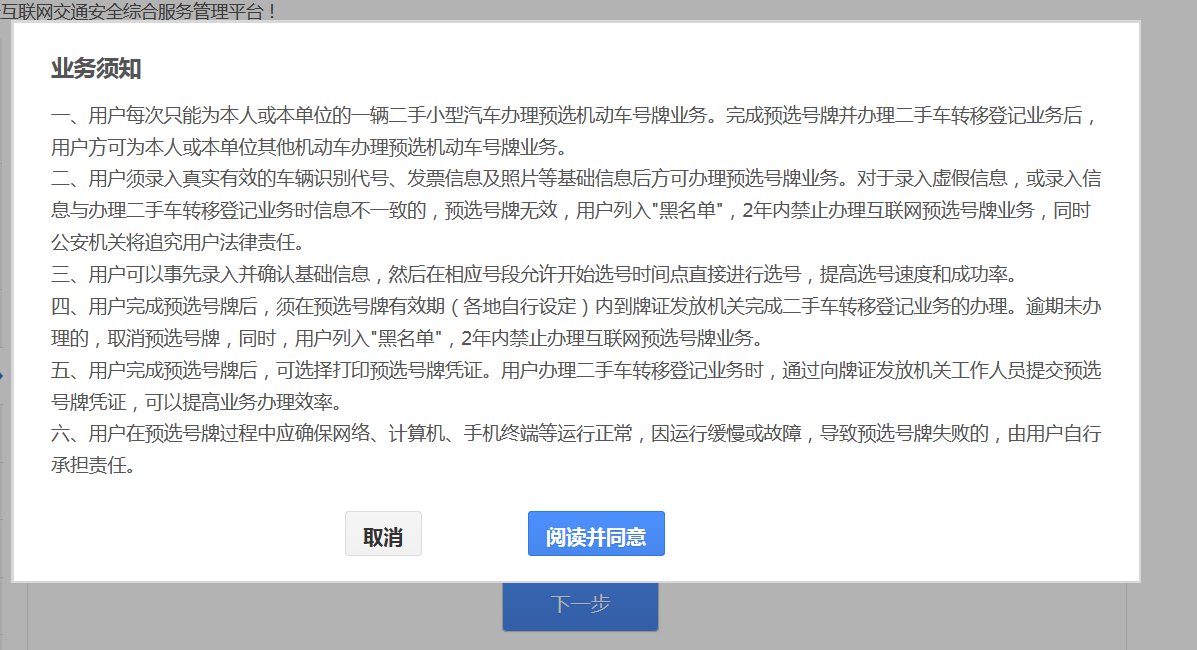 点击上图中的【下一步】按钮时,系统会弹出业务须知的对话框,界面如下图所示,业务须知具体内容由各地自行维护,下图只是示例,不代表本平台选号的业务须知内容。 请用户在预选号牌时务必仔细阅读业务须知,了解业务相关规则。用户点击对话框中的【阅读并同意】按钮进入第一阶段步骤2【确认信息】步骤。
