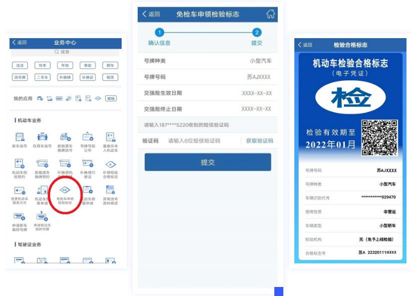 (2)对六年内免检车辆,机动车所有人可以直接通过互联网交通安全综合服务平台或“交管12123”手机APP申领检验标志电子凭证,如需领取纸质凭证的,可以选择邮寄送达或到车管所自取。