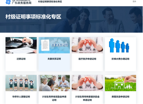 2.在广东政务服务网东莞专区的便民利企栏目,点击“村级证明标准化专区”,选择具体业务,点击在线办理。
