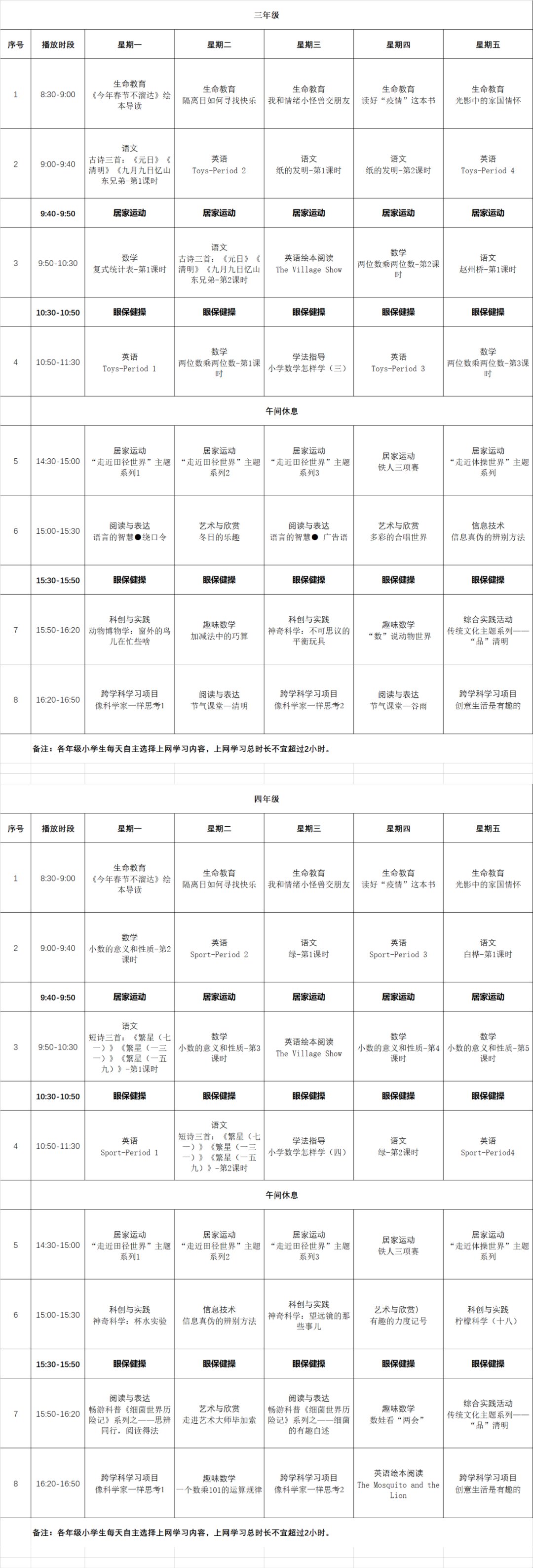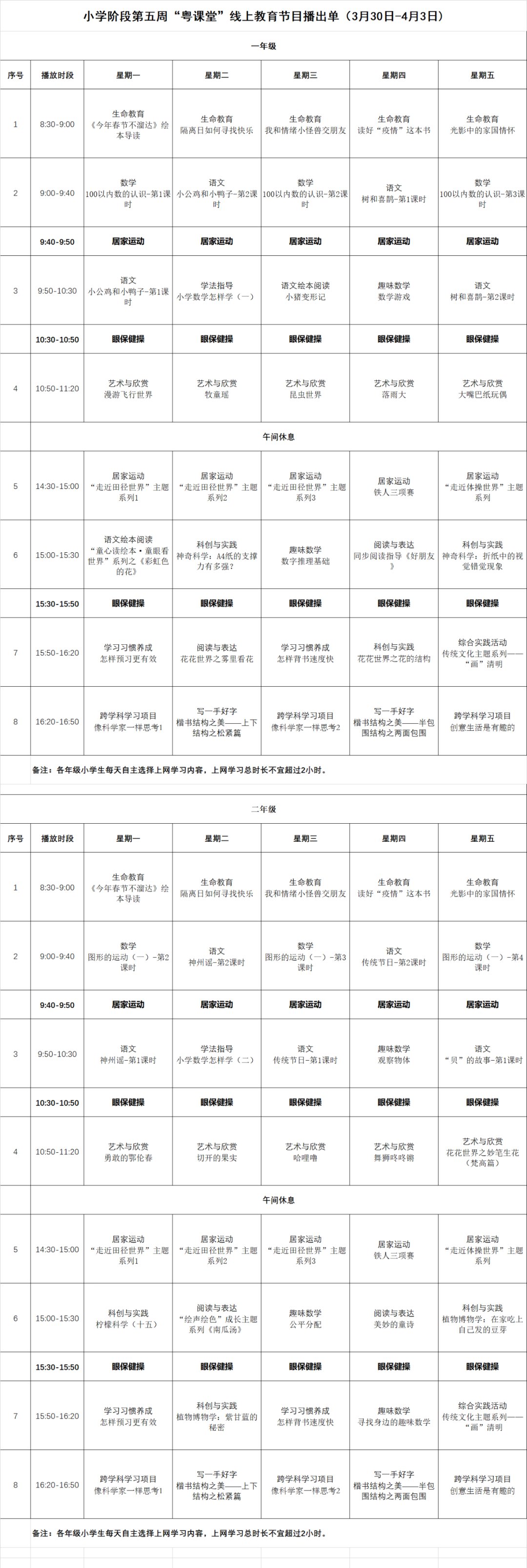 小学阶段第五周“粤课堂”线上教育节目播出单