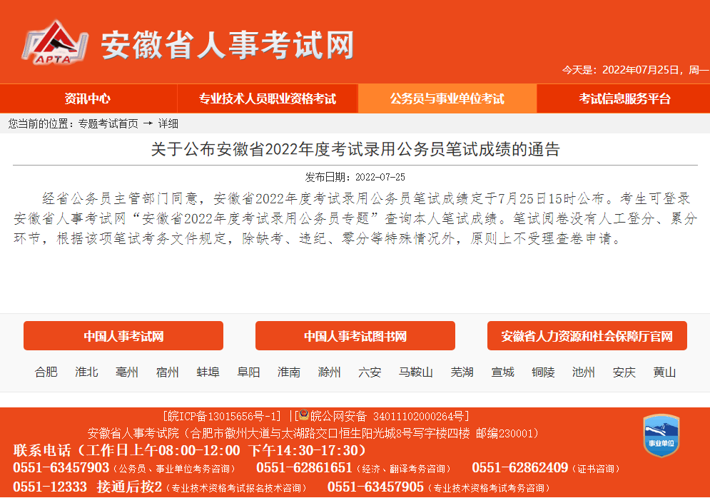 7月25日,安徽省人事考试网发布《关于公布安徽省2022年度考试录用公务员笔试成绩的通告》