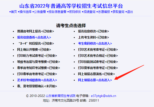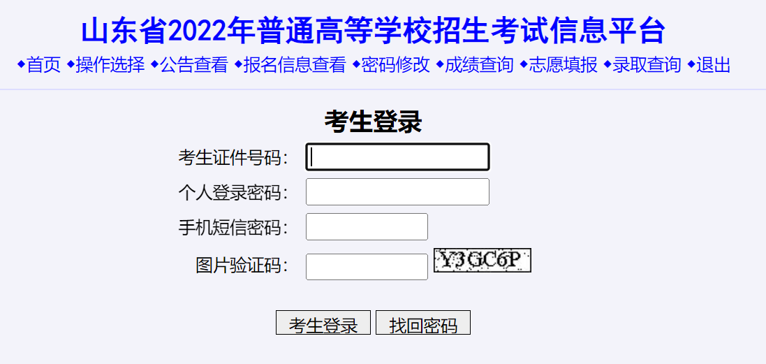 1、考生进入山东普通高等学校招生考试信息平台系统(>>>点击进入平台)主页,如下图:
