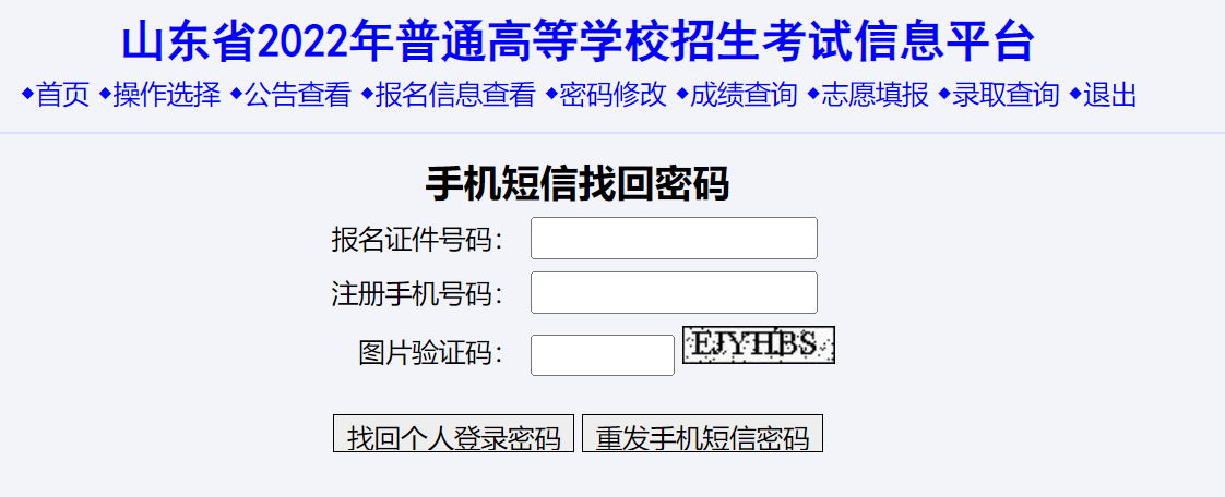 6、考生若忘记登录密码或手机短信密码,均可在此页面点击“找回密码”通过手机号码自行找回,“手机短信找回密码”操作页面如下图: