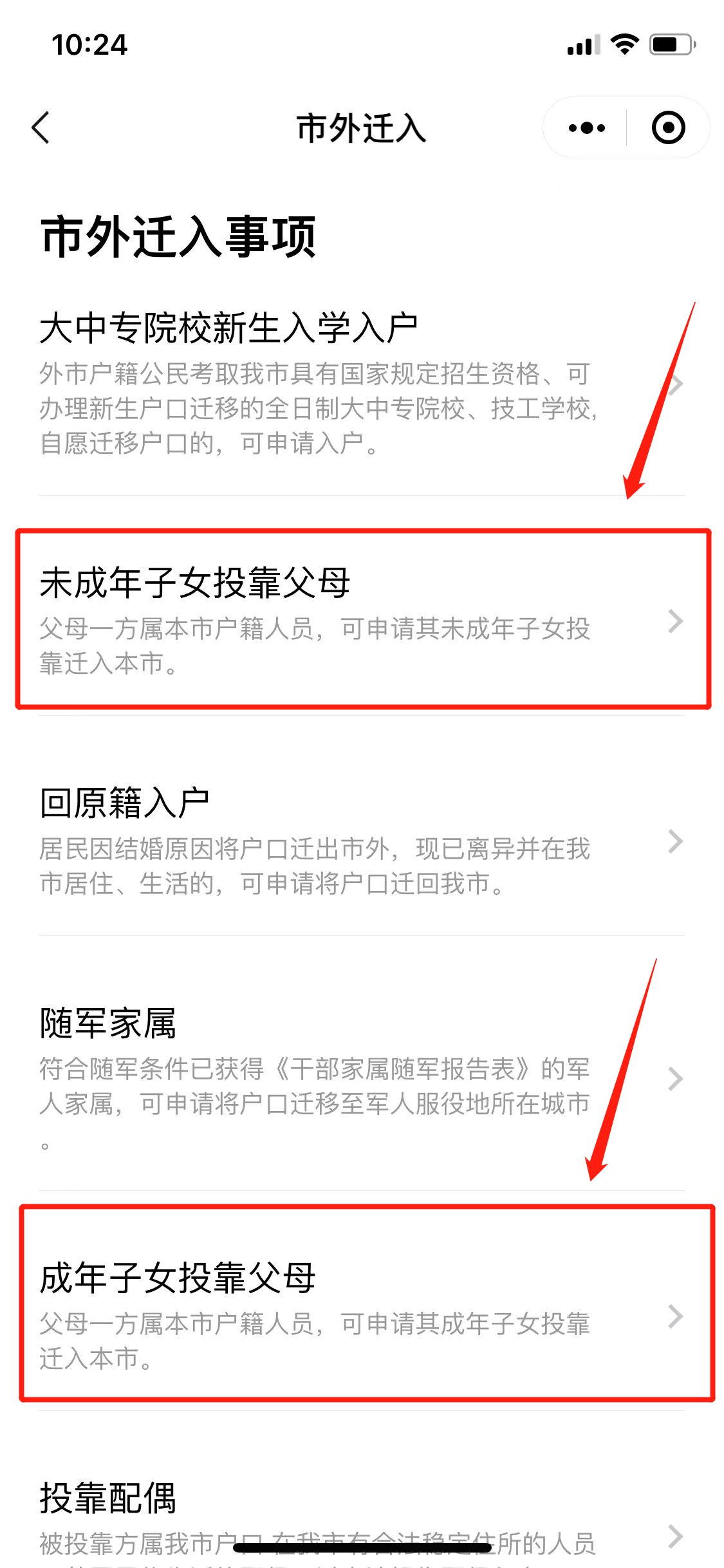 第五步:根据自身情况选择【未成年子女投靠父母】或【成年子女投靠父母】。