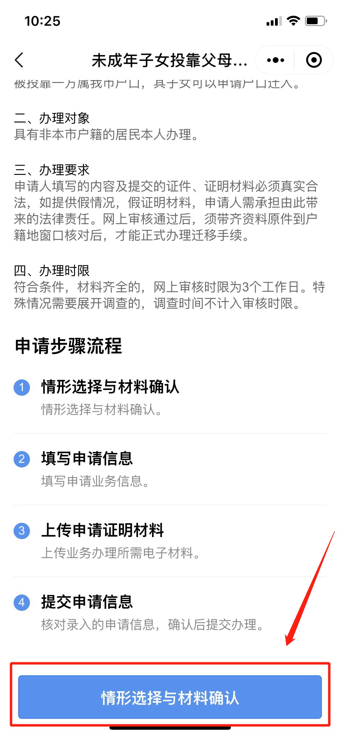 第六步:阅读办事指南及申请步骤流程后点击“情形选择与材料确认”,按照系统提示操作即可办理。