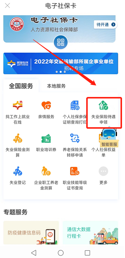 ★电子社保卡领取成功后,自动跳转到电子社保卡界面,【全国服务】选项下点击【失业保险待遇申领】,找到【失业补助金申领】按提示办理即可。