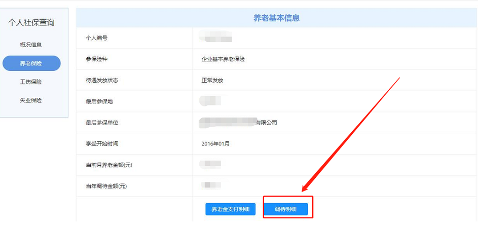 Ps:若参险类型为机关事业单位养老保险,则会在基本信息的险种类型上体现,其他查询步骤与城镇企业基本养老保险相同。
